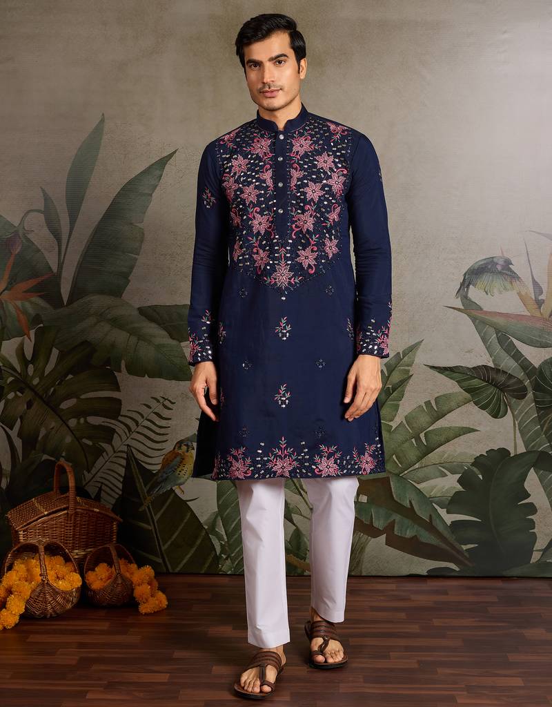 • Product Id : 4694428 • Package Details : 1 Kurta • Type : Kurta • Fabric : Viscose • Work : Embroidered • Type : Mirror Work • Look : Traditional • Sleeve : Full Sleeve • Neck Style : Band Collar Neck Kameez • Color : Navy Blue • Top Color : Blue • Top Fabric : Silk,Viscose • Stitching : Stitched Payments [+]