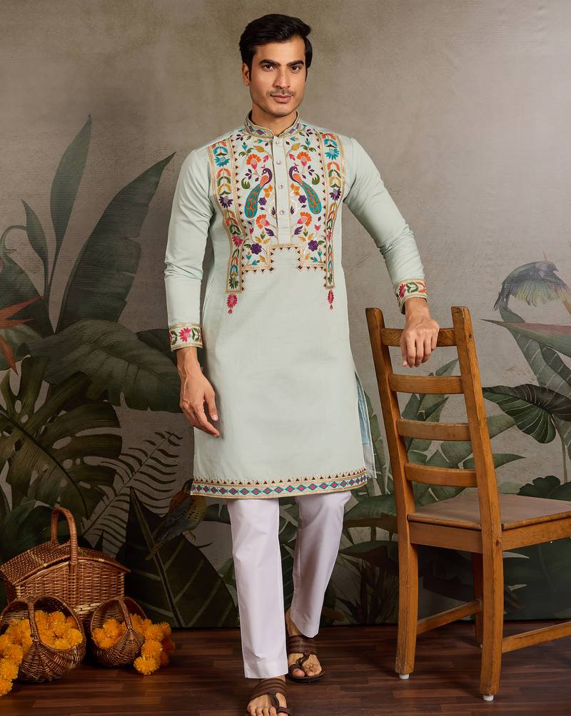 • Product Id : 4694411 • Package Details : 1 Kurta • Type : Kurta • Occasion : Wedding • Fabric : Viscose • Work : Embroidered • Type : Thread Work • Look : Designer • Sleeve : Full Sleeve • Neck Style : Band Collar Neck Kameez • Color : Sea Green • Top Color : Green • Top Fabric : Silk,Viscose • Stitching : Stitched Payments [+]