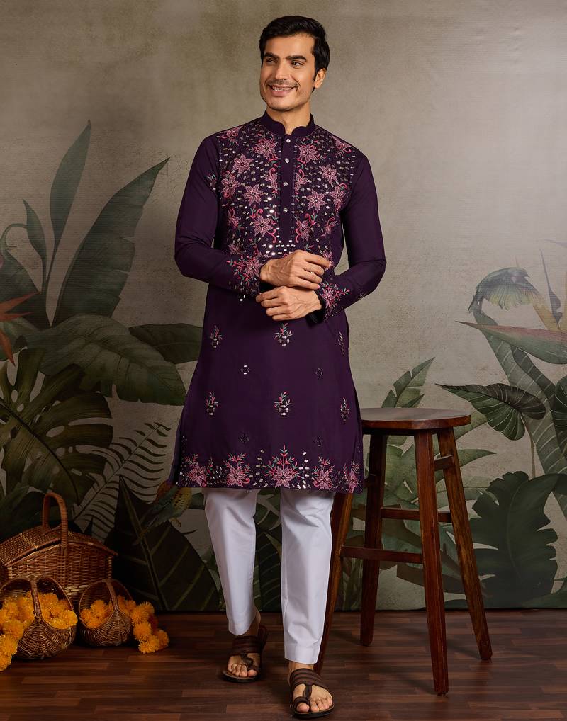 Purple Viscose Silk Real Mirror With Thread & Sequence Embroidered Work Kurta Only