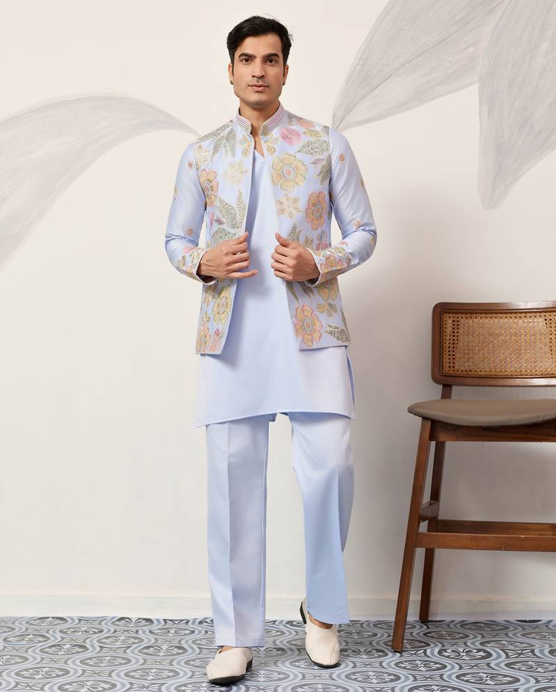 • Product Id : 4694438 • Package Details : 1 Kurta/1 Bottom/1 Jacket • Type : Nehru Jacket • Occasion : Wedding • Fabric : Satin • Work : Embroidered • Type : Thread Work • Look : Designer • Sleeve : Full Sleeve • Neck Style : Band Collar Neck Kameez • Bottom Fabric : Satin • Bottom Color : Sky Blue • Color : Sky Blue • Top Color : Blue • Top Fabric : Silk,Satin • Bottom Style : Pyjama • Stitching : Stitched Payments [+]