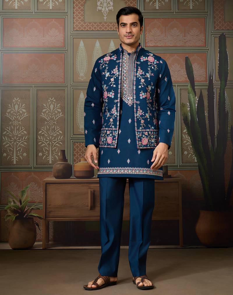 • Product Id : 4694400 • Package Details : 1 Kurta/1 Bottom/1 Jacket • Type : Nehru Jacket • Occasion : Ceremonial • Fabric : Viscose • Work : Embroidered • Type : Thread Work • Look : Contemporary • Sleeve : Full Sleeve • Neck Style : Band Collar Neck Kameez • Bottom Fabric : Viscose • Bottom Color : Teal • Color : Teal • Top Color : Blue • Top Fabric : Silk,Viscose • Bottom Style : Pyjama • Stitching : Stitched Payments [+]