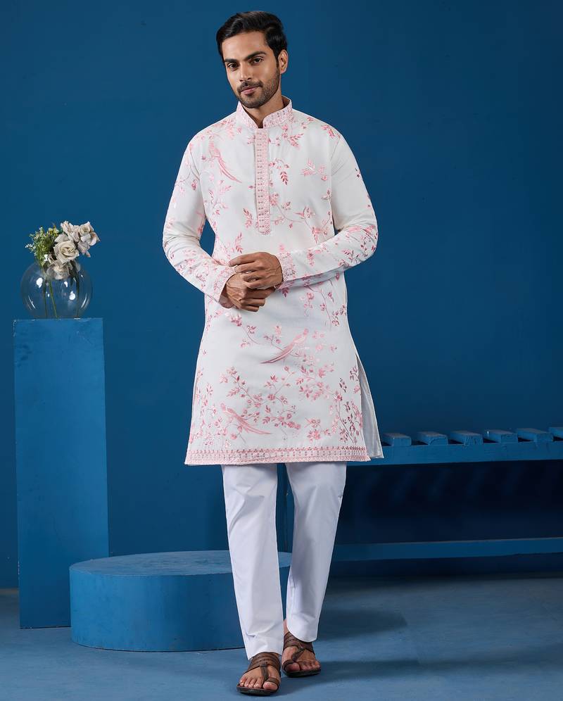 White Viscose Silk Thread With Sequence Embroidered Work Kurta Only