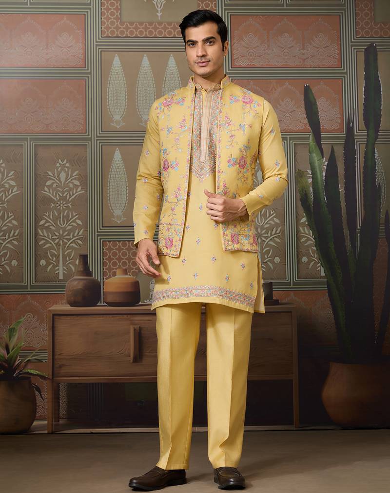 • Product Id : 4694403 • Package Details : 1 Kurta/1 Bottom/1 Jacket • Type : Nehru Jacket • Occasion : Wedding • Fabric : Viscose • Work : Embroidered • Type : Thread Work • Look : Designer • Sleeve : Full Sleeve • Neck Style : Band Collar Neck Kameez • Color : Yellow • Bottom Fabric : Viscose • Bottom Color : Yellow • Top Color : Yellow • Top Fabric : Silk,Viscose • Bottom Style : Pyjama • Stitching : Stitched Payments [+]