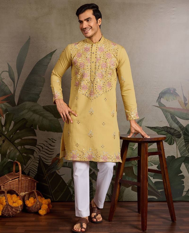 • Product Id : 4694423 • Package Details : 1 Kurta • Type : Kurta • Occasion : Ceremonial • Fabric : Viscose • Work : Embroidered • Type : Mirror Work • Look : Contemporary • Sleeve : Full Sleeve • Neck Style : Band Collar Neck Kameez • Color : Yellow • Top Color : Yellow • Top Fabric : Silk,Viscose • Stitching : Stitched Payments [+]