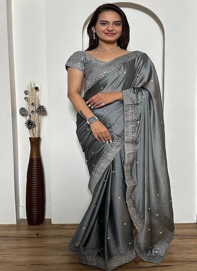 • Border : Designer Border • Fabric Of : Silk • Color : Grey • Color : Gray Blouse Details