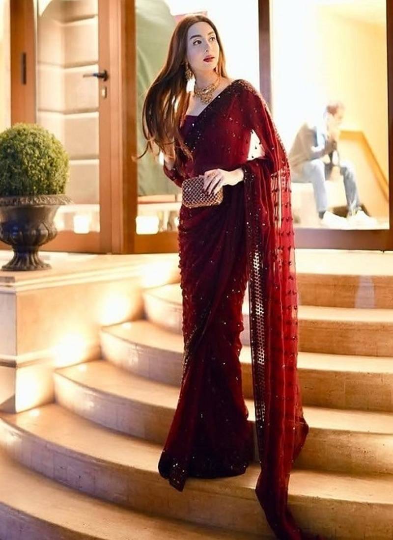 Maroon Georgette Sequins Work Saree With Matching Unstitched Georgette Blouse – Premium Party & Festive Wear