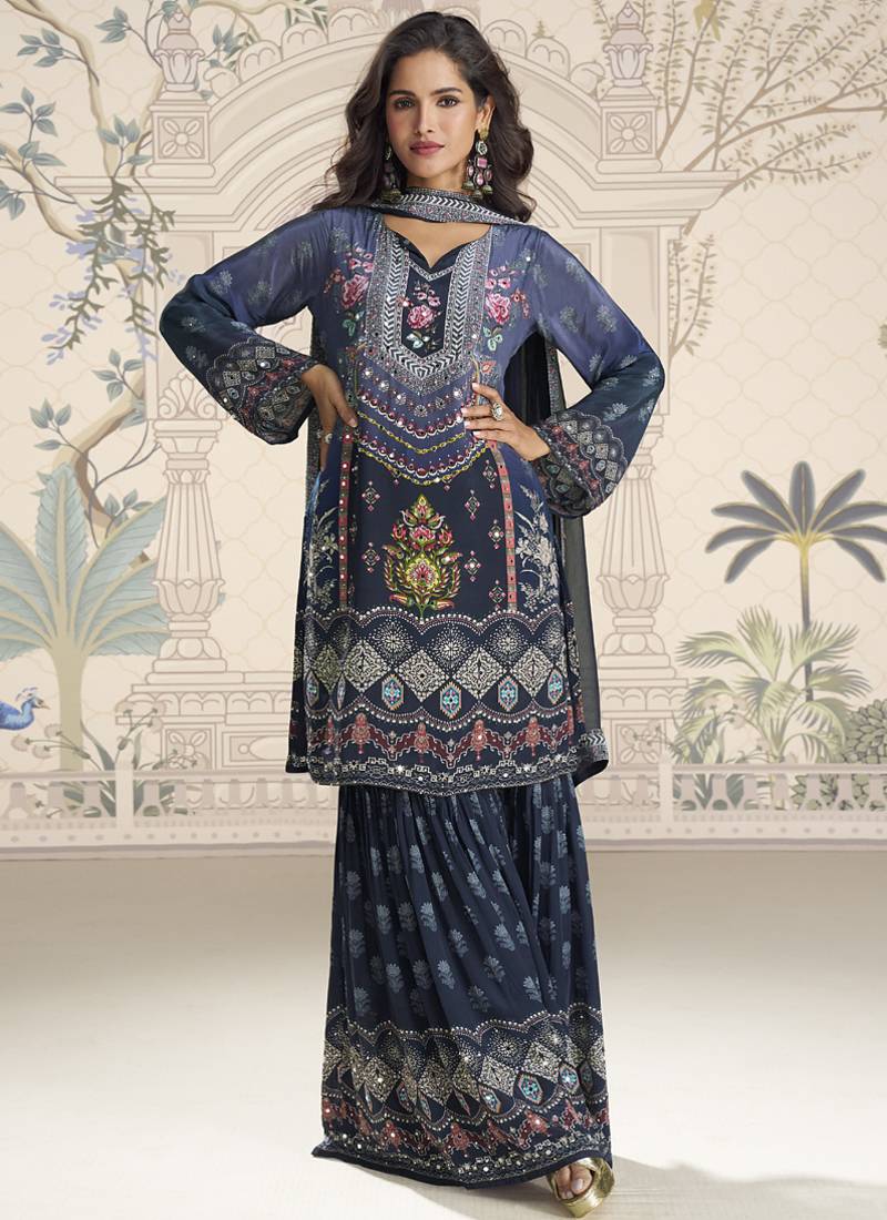 Blue Crerpe Silk Mirror Work Designer Plazzo Suit Stitched