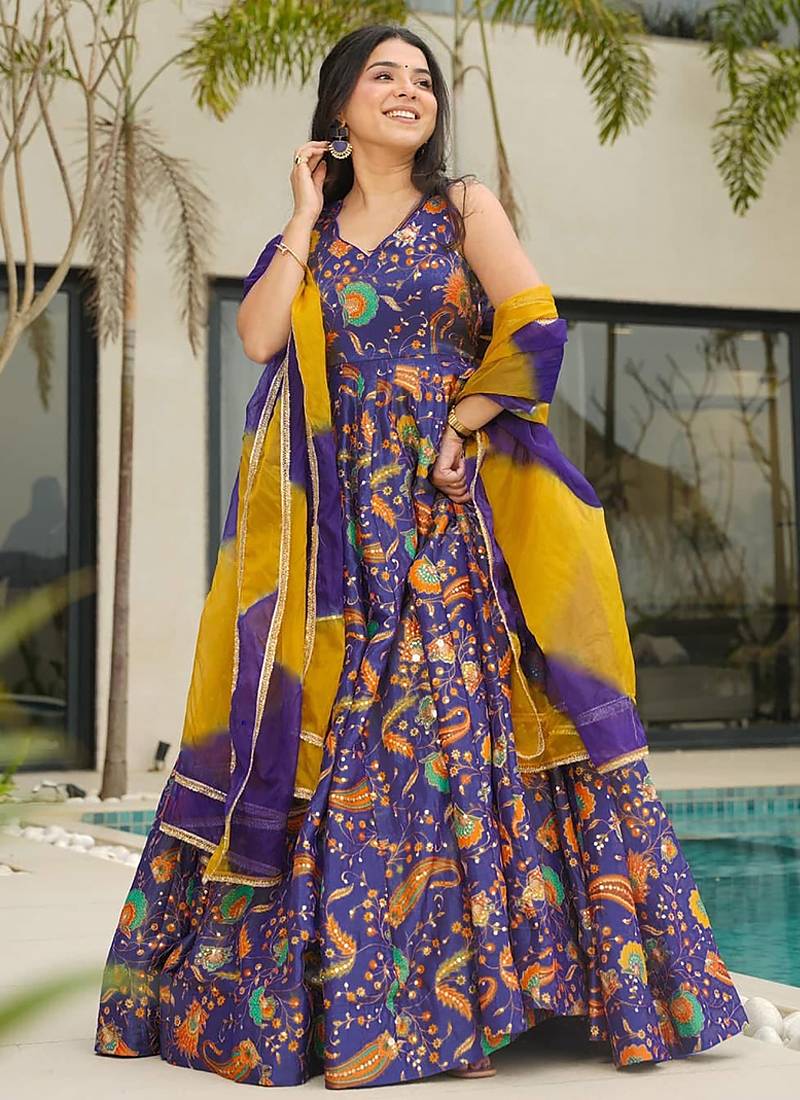 • Product Id : 4713742 • Package Details : 1 Gown /1 Dupatta • Type : Anarkali Suit • Type : Sequins Work • Sleeve : Sleeveless • Neck Style : V Neck • Fabric : Art Silk • Color : Blue • Work : Floral Print • Stitching : Stitched Payments [+]