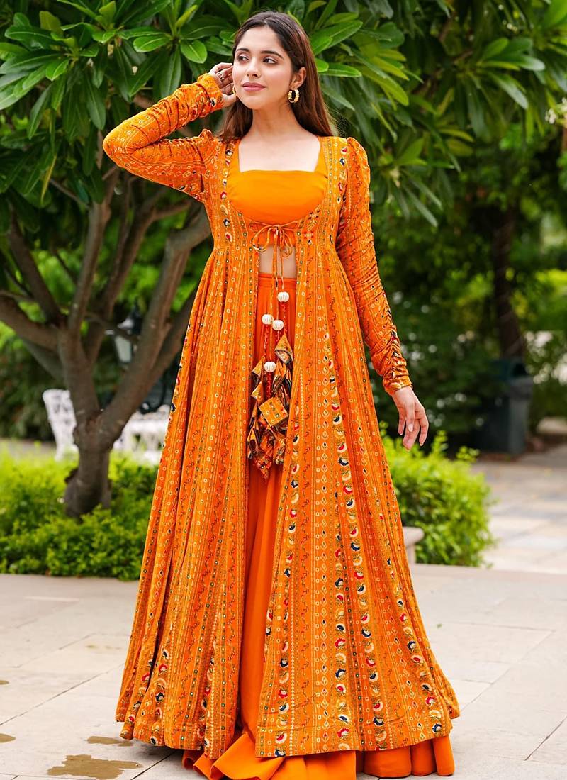 • Product Id : 4713752 • Package Details : 1 Top / 1 Jacket / Bottom • Type : Anarkali Suit • Type : Sequins Work • Sleeve : Full Sleeve • Neck Style : U Neck • Fabric : Rayon • Color : Orange • Work : Floral Print • Stitching : Stitched Payments [+]