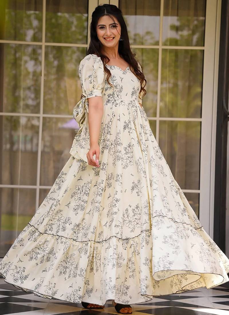 • Product Id : 4713730 • Package Details : 1 Top • Type : Anarkali Suit • Type : Sequins Work • Sleeve : Half Sleeve • Neck Style : V Neck • Fabric : Rayon • Color : Cream • Work : Floral Print • Stitching : Stitched Payments [+]