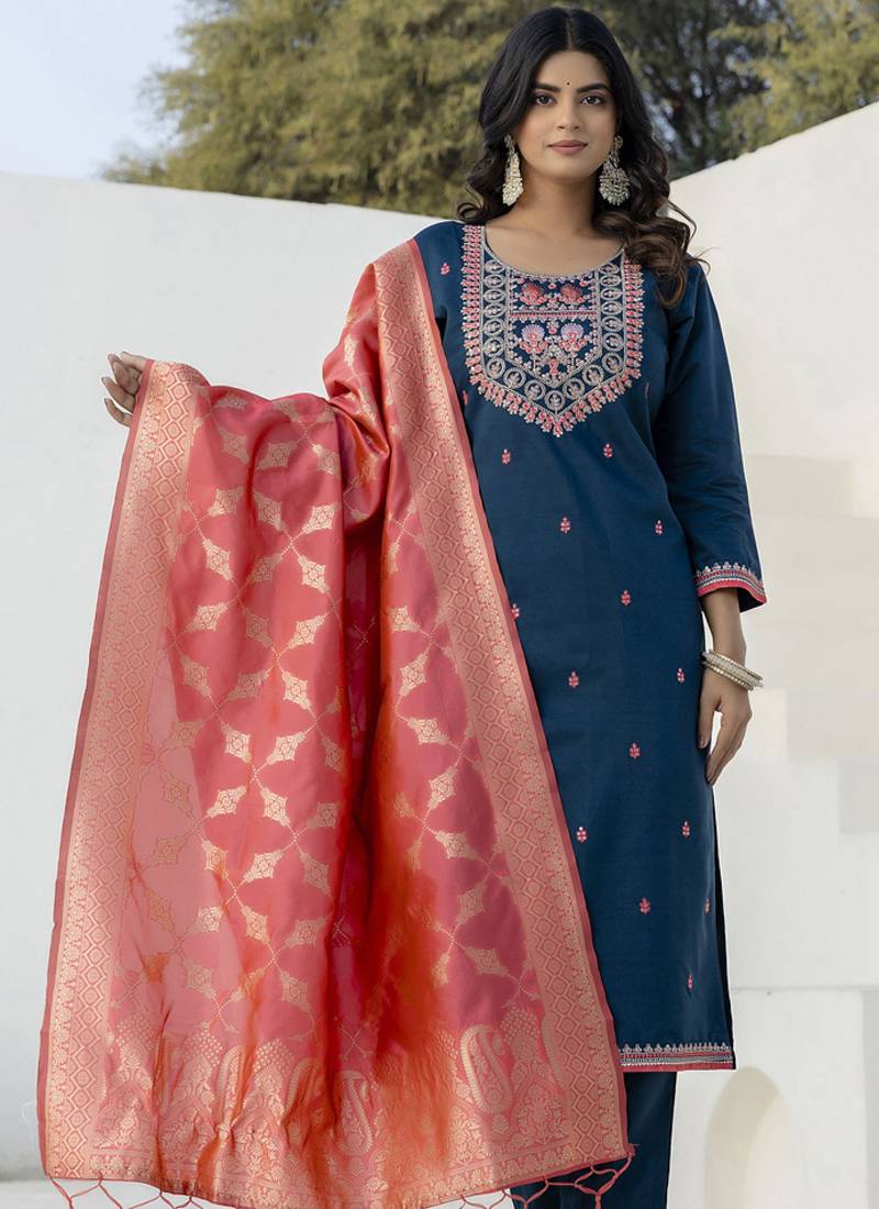 Dark Blue Embroidered Blend Silk Salwar Suit Stitched