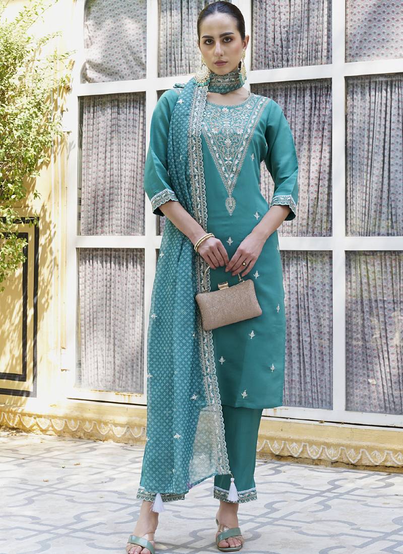 Dark Turquoise Embroidered Blend Silk Salwar Suit Stitched