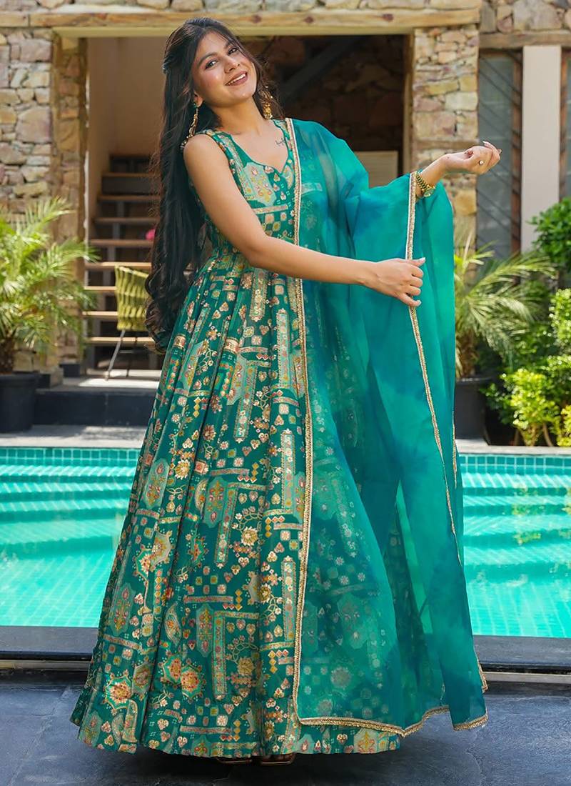 • Product Id : 4713745 • Package Details : 1 Gown /1 Dupatta • Type : Anarkali Suit • Type : Sequins Work • Sleeve : Sleeveless • Neck Style : V Neck • Fabric : Art Silk • Color : Green • Work : Floral Print • Stitching : Stitched Payments [+]