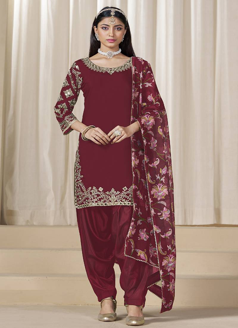 Maroon Roman Silk Embroidered Salwar Suit For Festival Semi stitched