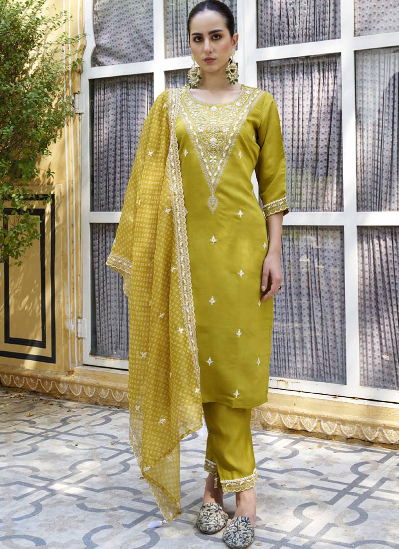 Mehendi Embroidered Blend Silk Salwar Suit Stitched