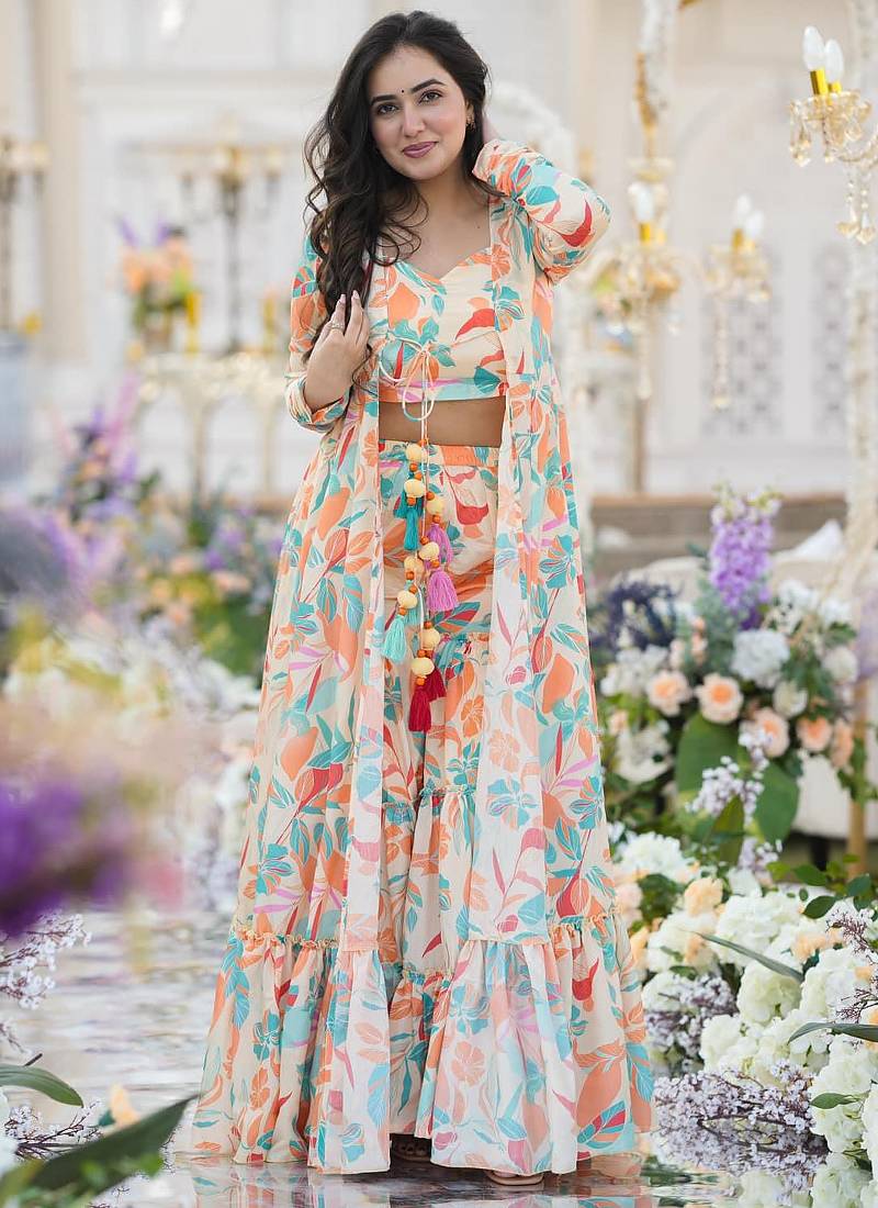 Off White Chinon Silk Digital Print Plazzo With Strug Indowestern Suit Stitched