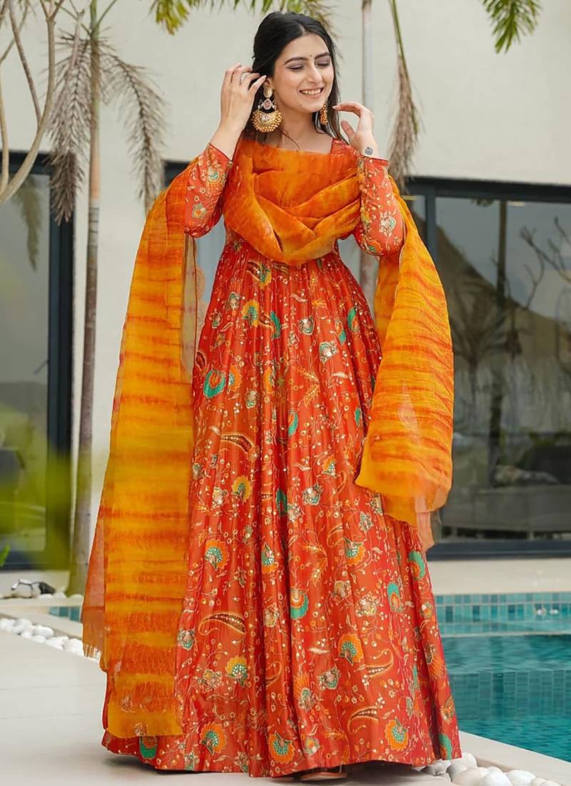 • Product Id : 4713744 • Package Details : 1 Gown /1 Dupatta • Type : Anarkali Suit • Type : Sequins Work • Sleeve : Full Sleeve • Neck Style : V Neck • Fabric : Art Silk • Color : Orange • Work : Floral Print • Stitching : Stitched Payments [+]