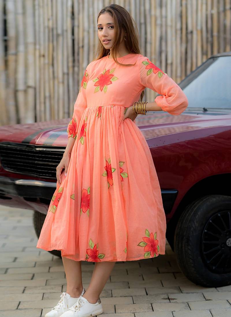 • Product Id : 4714400 • Package Details : 1 Top • Type : Long Kurti Designs • Sleeve : Elbow Sleeve • Neck Style : V Neck • Occasion : Formal • Fabric : Rayon • Color : Peach • Work : Digital Print • Stitching : Stitched Payments [+]