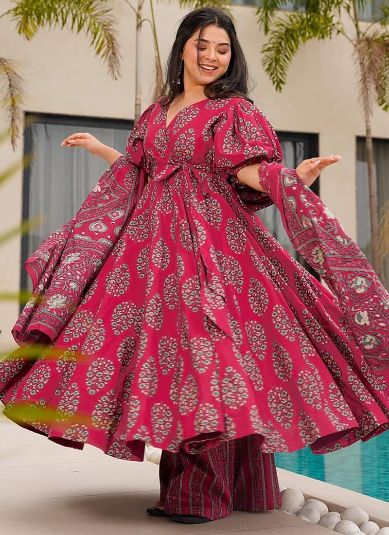 Pink Floral Print Cotton Anarkali Suit Stitched