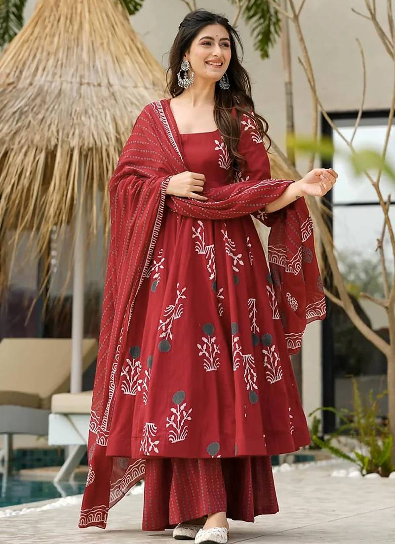 • Product Id : 4713738 • Package Details : 1 Top/1 Bottom/1 Dupatta • Type : Anarkali Suit • Type : Sequins Work • Sleeve : Full Sleeve • Neck Style : U Neck • Fabric : Cotton • Color : Red • Work : Floral Print • Stitching : Stitched Payments [+]