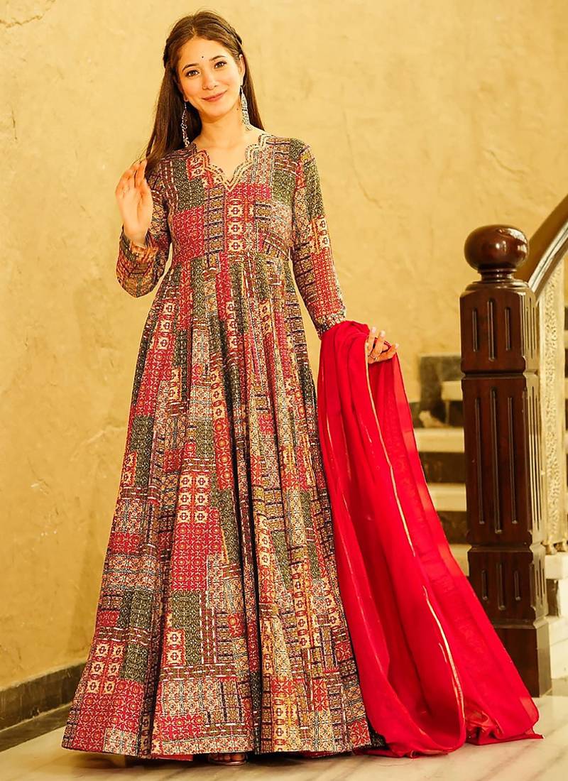 Red Reyon Digital Print Designer Gown For Festive Stitched