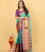 • Saree : Color- Aqua Blue / Fabric- Cotton Silk • Blouse : Color- Purple / Fabric- Jacquard Saree Details