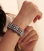This Eye-Catching Janvi Bracelet Crafted With Shimmering Moissanite Polki Diamonds In An Uneven, Open Setting Exudes A Captivating, Organic Charm. The Gajra-Style Design, Complemented By Rich Dark Blue Meenakari, Creates A Nature-Inspired, Heirloom-Worthy Aesthetic. Delicate Filigree Work On The Inner Side Adds A Touch Of Artisanal Flair, While The Adjustable, Double-Lock Clip Closure Ensures A Secure, Comfortable Fit.