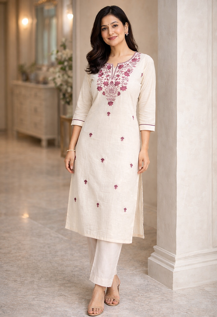 Add effortless grace to your ethnic collection with this beautifully crafted off-white kurta and pant set. Made from breathable cotton flex fabric, the ensemble showcases delicate floral embroidery along the neckline and subtle motifs across the kurta, creating a look that is both refined and timeless.