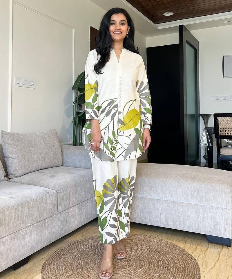 Off White Leaf Printed Cotton Flex Kurta Set