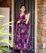 Plum Purple Floral Anarkali Kurta Pant Set With Dupatta