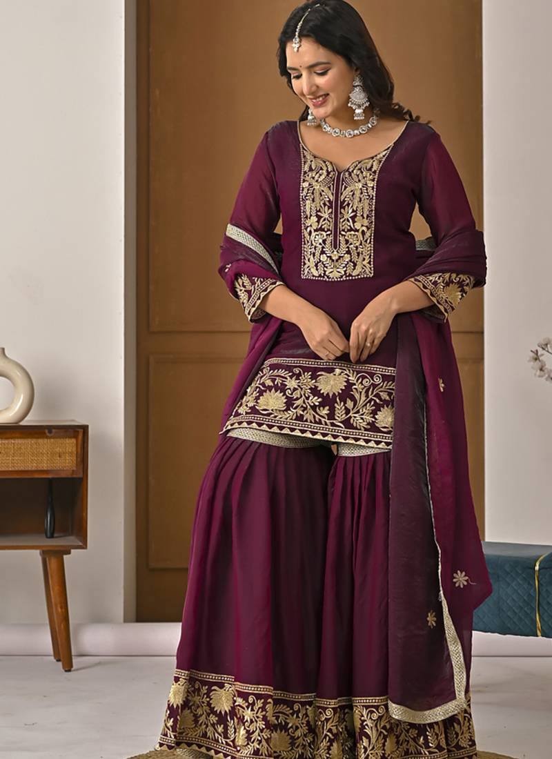 Deep Wine Embroidery Fendy Silk Fully Stitched Sarara Palazzo Suit Set