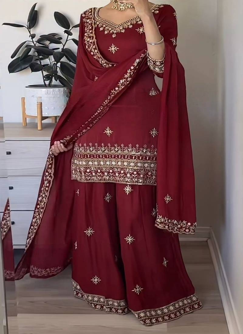 Maroon Embroidery Satin Fully Stitched Sarara Palazzo Suit Set