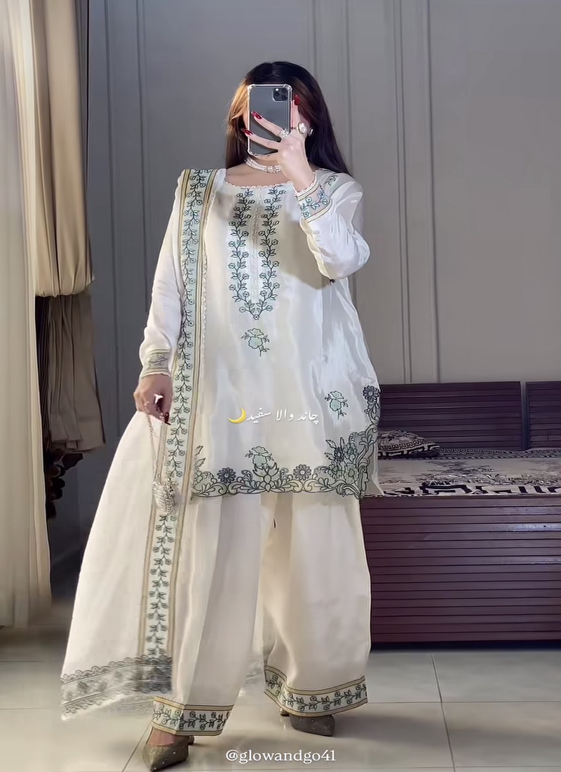 Off White Embroidery Crep Fully Stitched Farshi Salwar Suit Set