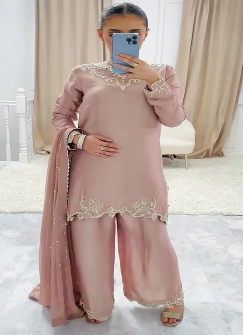 Peach Embroidery Crep Fully Stitched Farshi Salwar Suit Set