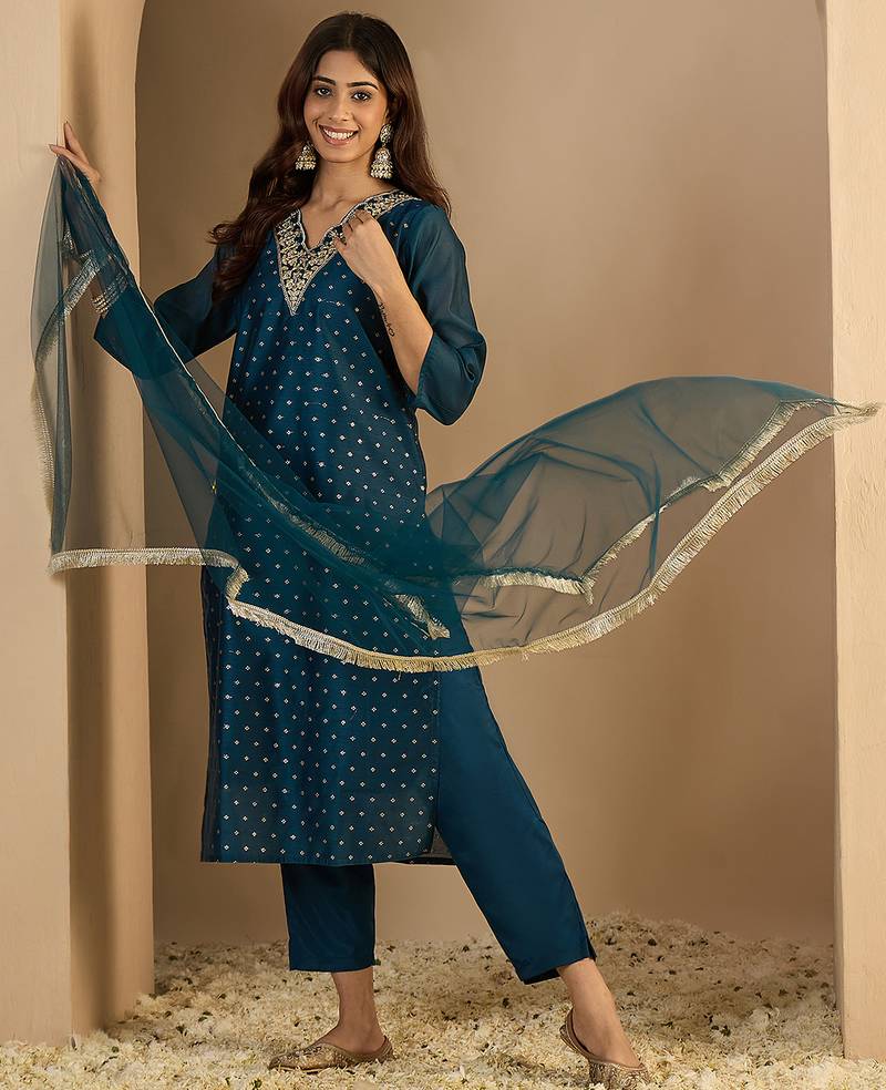 • Product Id : 4713394 • Package Details : 1 Top/1 Bottom/1 Dupatta • Type : Kurta Sets • Work : Embroidered • Look : Designer • Sleeve : Quarter Sleeve • Neck Style : V Neck • Fabric : Chanderi • Color : Blue • Stitching : Stitched Payments [+]