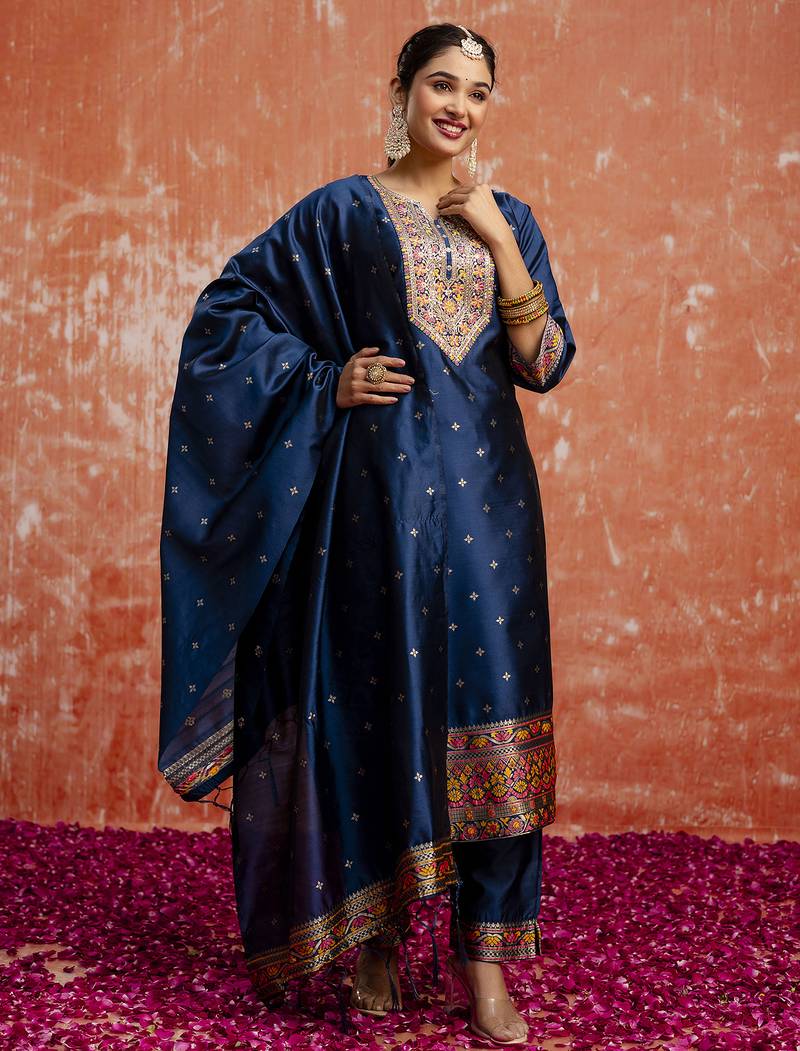 • Product Id : 4712743 • Package Details : 1 Top/1 Bottom/1 Dupatta • Type : Kurta Sets • Work : Embroidered • Look : Designer • Sleeve : Quarter Sleeve • Neck Style : V Neck • Fabric : Cotton Silk • Color : Blue • Stitching : Stitched Payments [+]
