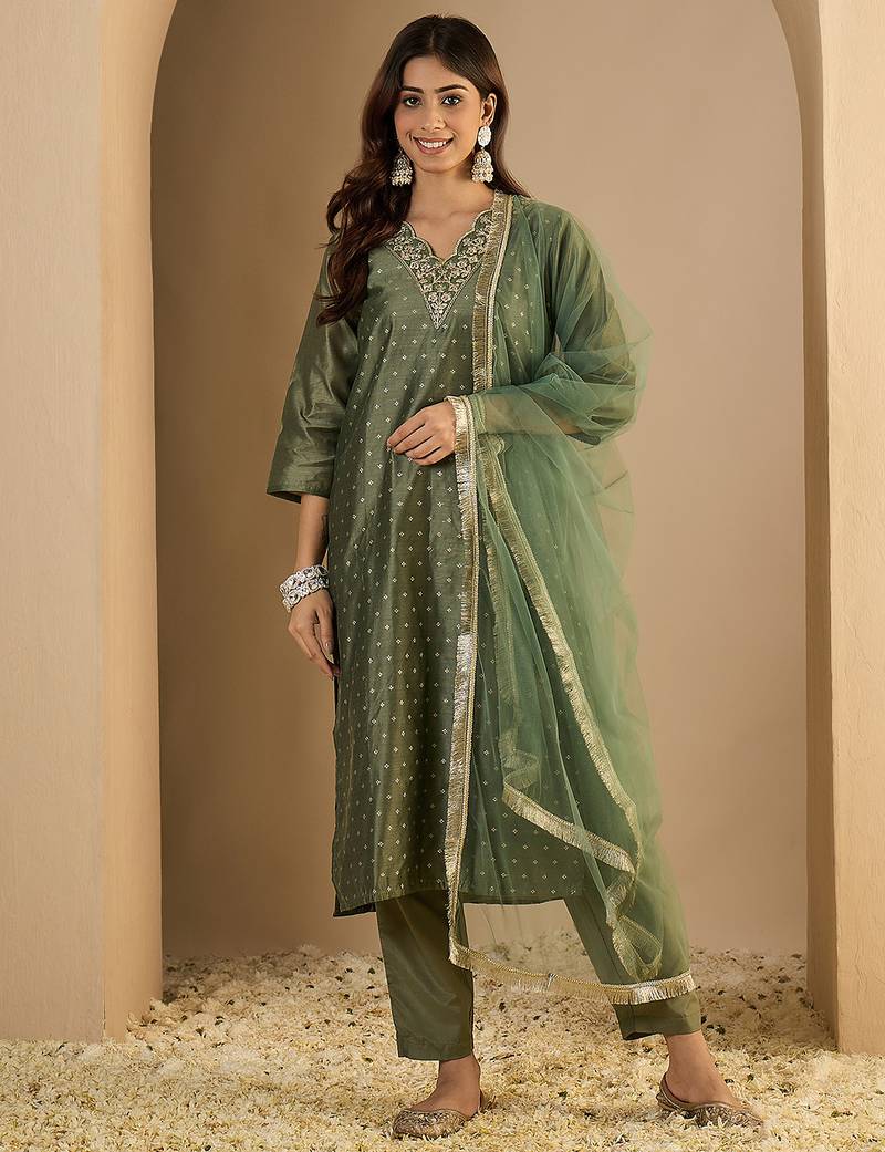 • Product Id : 4712751 • Package Details : 1 Top/1 Bottom/1 Dupatta • Type : Kurta Sets • Work : Embroidered • Look : Designer • Sleeve : Quarter Sleeve • Neck Style : V Neck • Fabric : Chanderi • Color : Green • Stitching : Stitched Payments [+]