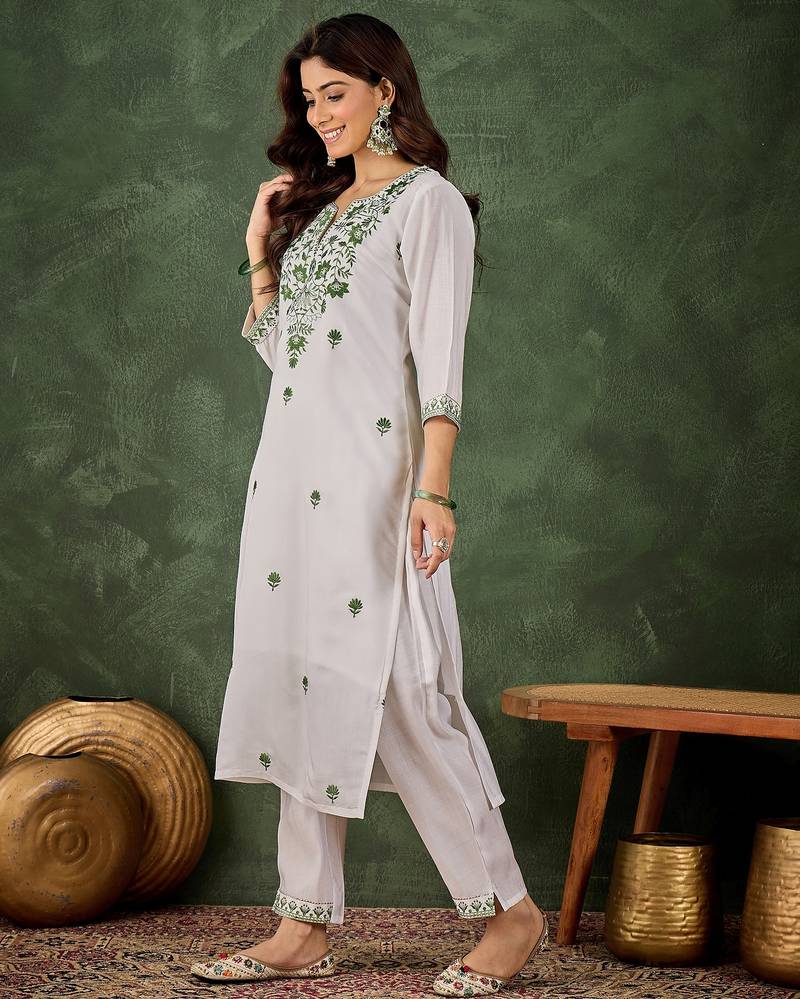 • Product Id : 4701424 • Package Details : 1 Top/1 Bottom • Type : Kurta Sets • Work : Embroidered • Look : Designer • Sleeve : Quarter Sleeve • Neck Style : V Neck • Occasion : Formal • Color : Green • Fabric : Silk Blend • Stitching : Stitched Payments [+]