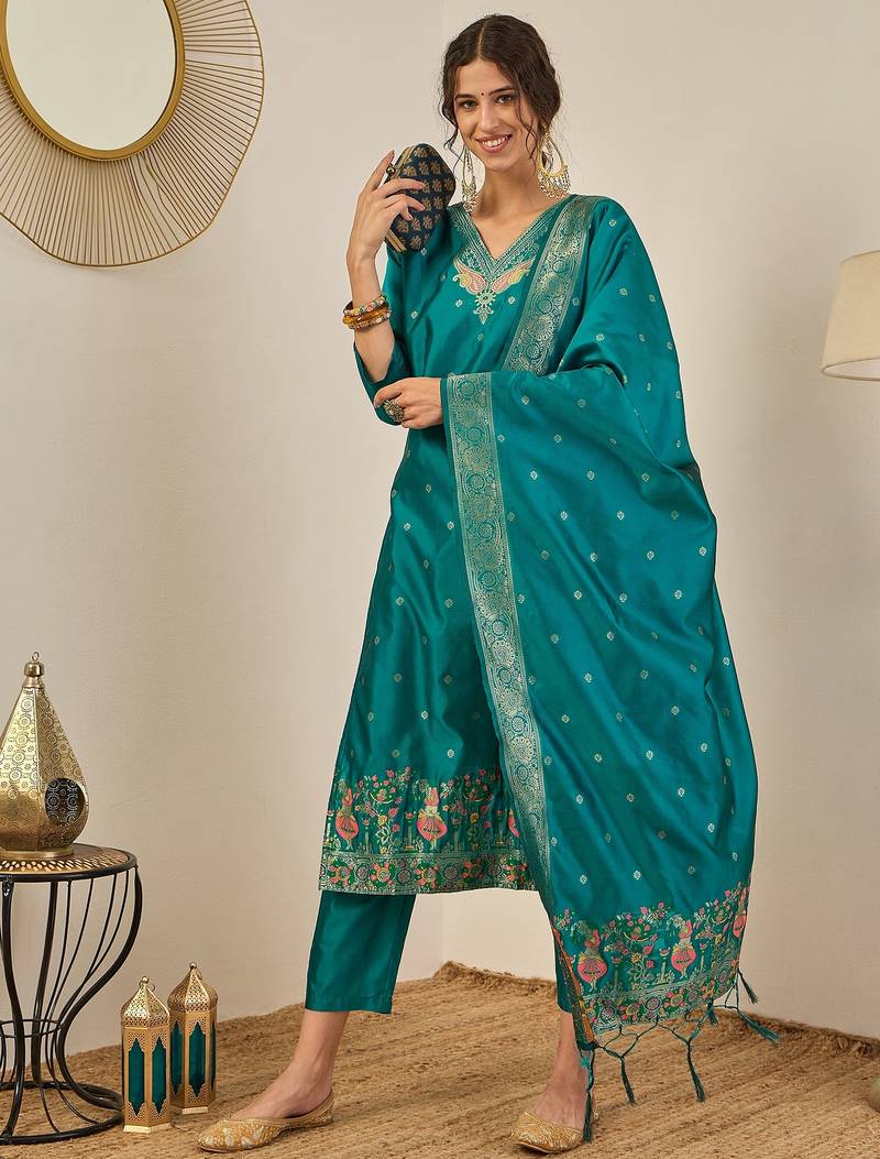 VredeVogel Cotton Silk Fabric in this attractive Color ready to wear Kurta Set will make sure that the fitting of this beautiful readymade Kurta Set looks elegant on you. Designed for effortless style and comfort. Crafted from Silk Blend Fabric , it is light in weight and will be soft against your skin. Its unique design and beautiful colour will fetch a lot of second glances as you club it with contrast colored pumps and flashy accessory. Our Products are Made and stitched using high grade fabrics and yarns under the strict surveillance of our well-versed Executives. It is capable of making you look gorgeous. Wear it and put your step in the world of fashion. It looks stunning every time you match it with accessories. The lightweight dupatta completes the ensemble with grace, making it perfect for festive occasions, casual outings, and special events. Pair it with statement accessories and traditional footwear for a timeless look