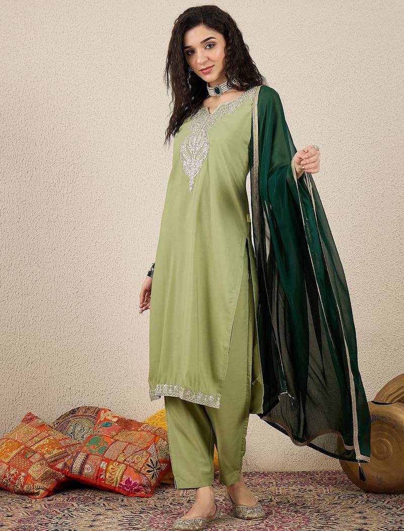 Light Green Women Kurta Pant Dupatta Set Stitched