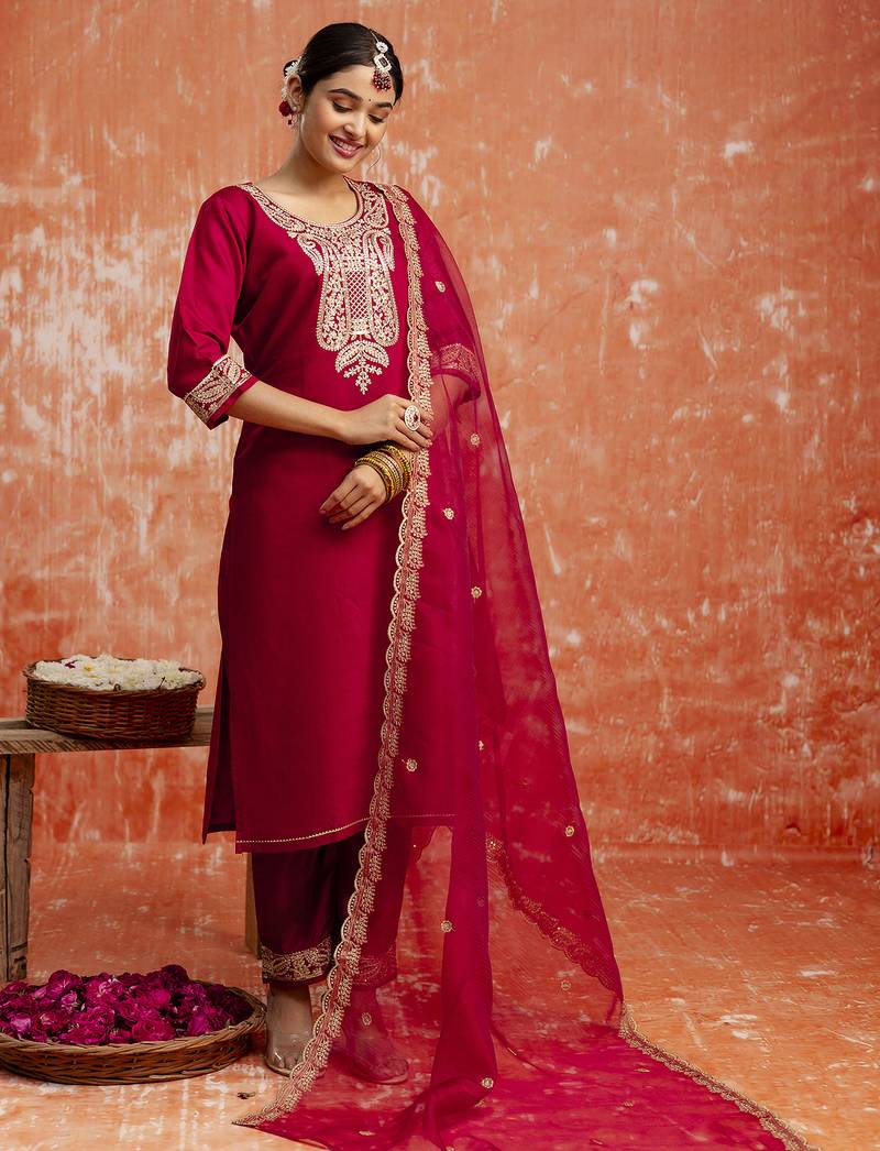 Maroon Women Kurta Pant Dupatta Set Stitched