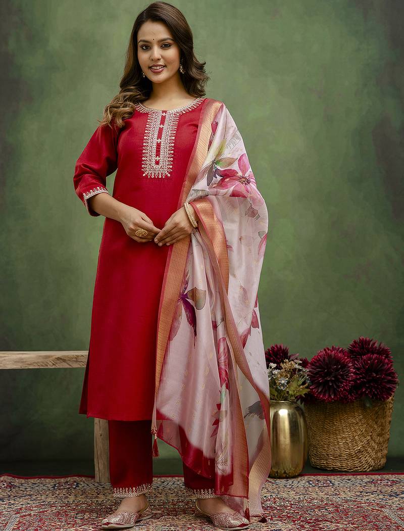 • Product Id : 4713468 • Package Details : 1 Top/1 Bottom/1 Dupatta • Type : Kurta Sets • Work : Embroidered • Look : Designer • Sleeve : Quarter Sleeve • Neck Style : Round Neck • Fabric : Cotton Silk • Color : Maroon • Stitching : Stitched Payments [+]