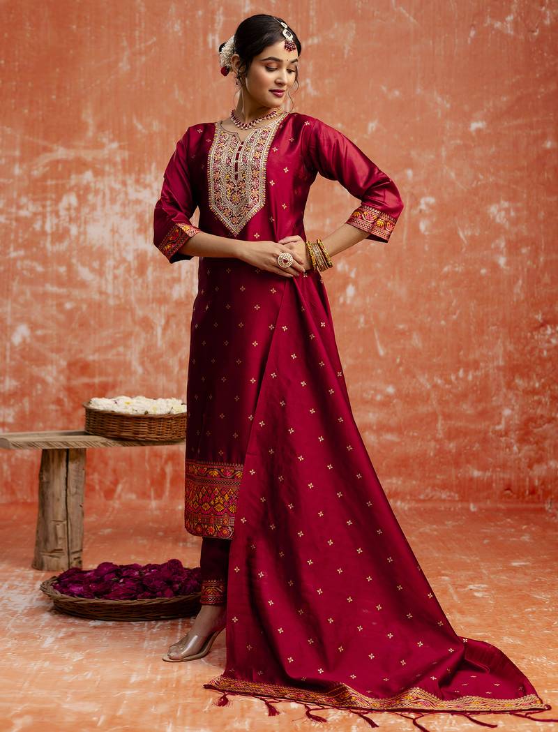 Maroon Women Kurta Pant Dupatta Set Stitched
