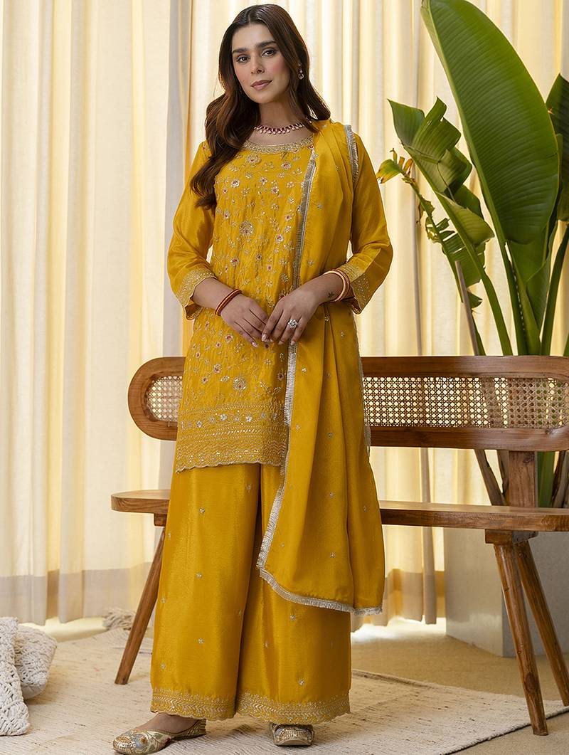 Mustard Women Kurta Palazzo Dupatta Set Stitched