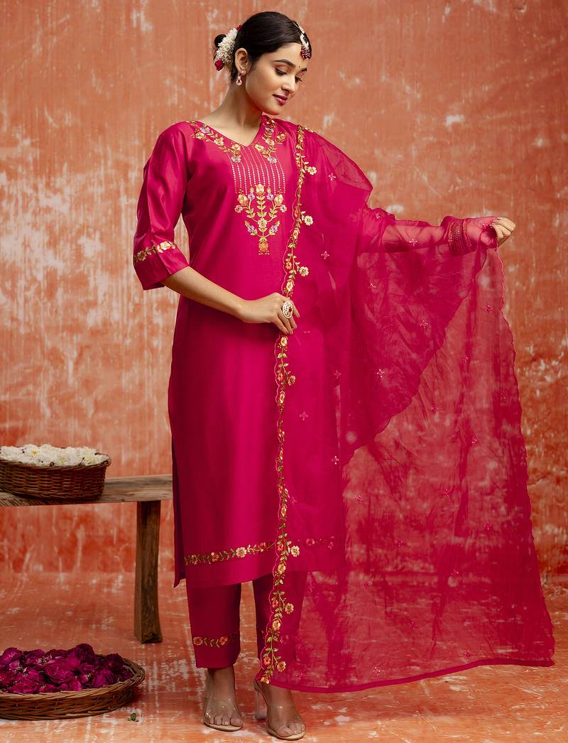 • Product Id : 4712730 • Package Details : 1 Top/1 Bottom/1 Dupatta • Type : Kurta Sets • Work : Embroidered • Look : Designer • Sleeve : Quarter Sleeve • Neck Style : V Neck • Color : Pink • Fabric : Faux Viscose Rayon • Stitching : Stitched Payments [+]