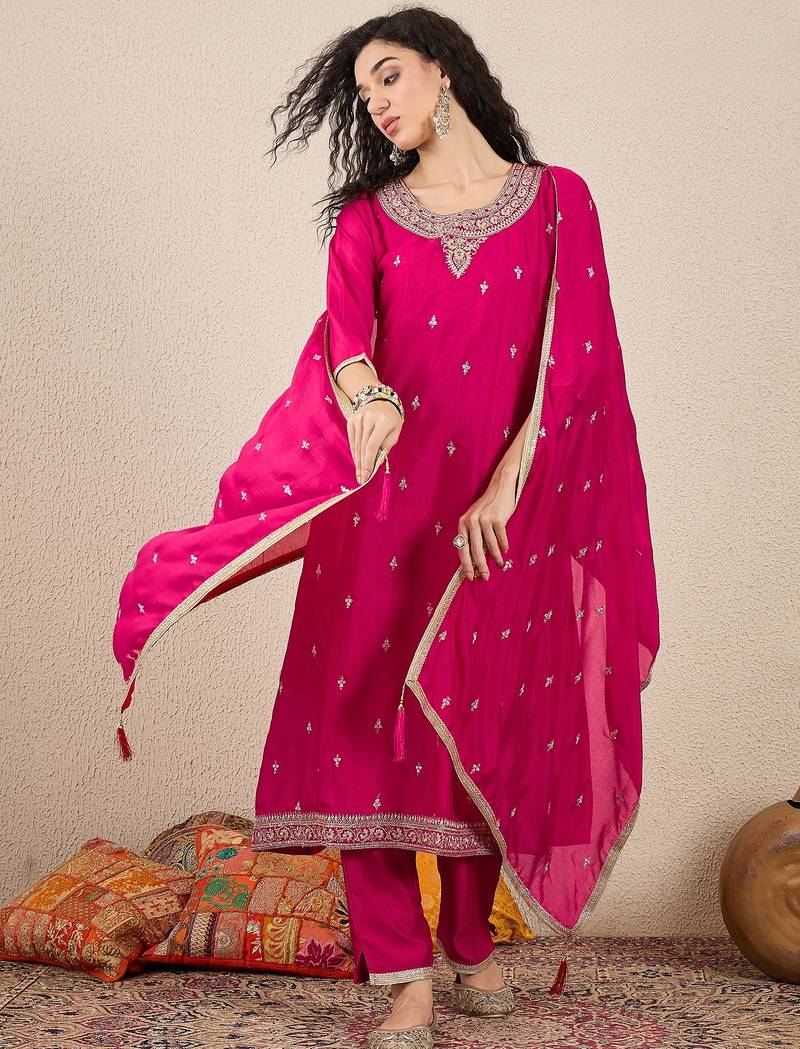 • Product Id : 4713464 • Package Details : 1 Top/1 Bottom/1 Dupatta • Type : Kurta Sets • Work : Embroidered • Look : Designer • Sleeve : Quarter Sleeve • Neck Style : Round Neck • Color : Pink • Fabric : Silk Blend • Stitching : Stitched Payments [+]