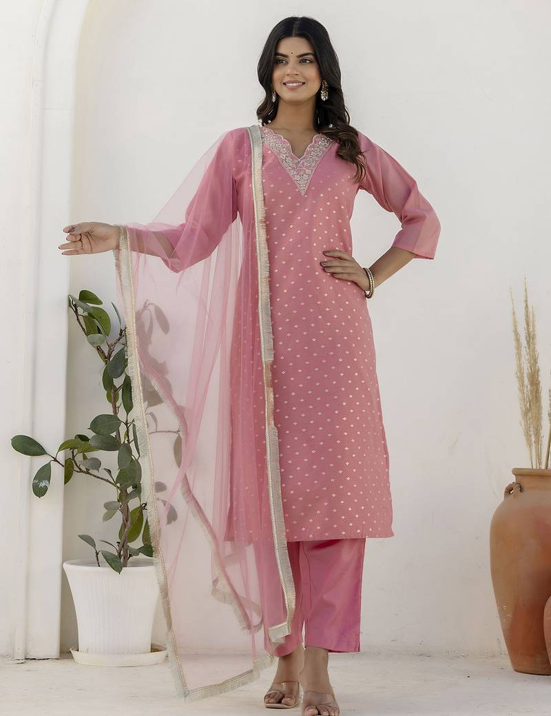 Pink Women Kurta Pant Dupatta Set Stitched