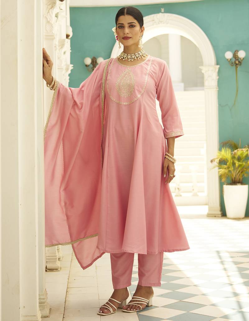• Product Id : 4702976 • Package Details : 1 Top/1 Bottom/1 Dupatta • Type : Kurta Sets • Work : Embroidered • Look : Designer • Sleeve : Quarter Sleeve • Neck Style : Round Neck • Color : Pink • Fabric : Silk Blend • Stitching : Stitched Payments [+]