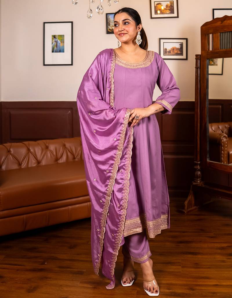 • Product Id : 4713424 • Package Details : 1 Top/1 Bottom/1 Dupatta • Type : Kurta Sets • Work : Embroidered • Look : Designer • Sleeve : Quarter Sleeve • Neck Style : Round Neck • Color : Purple • Fabric : Silk Blend • Stitching : Stitched Payments [+]
