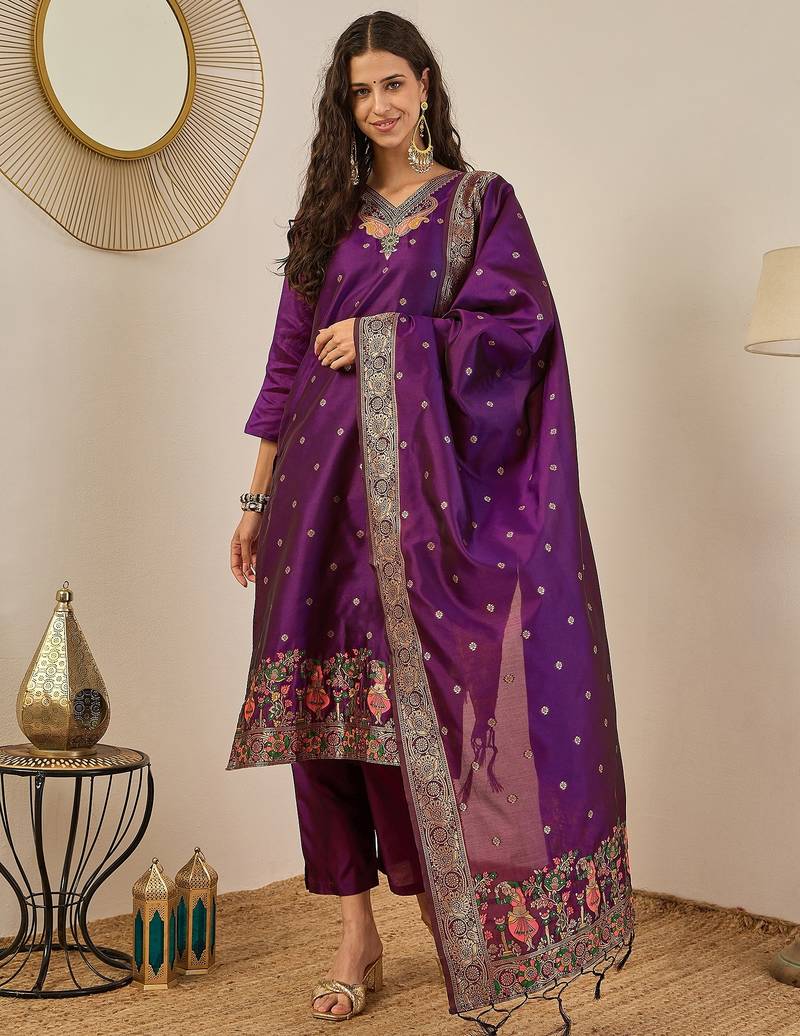 Purple Women Kurta Pant Dupatta Set Stitched